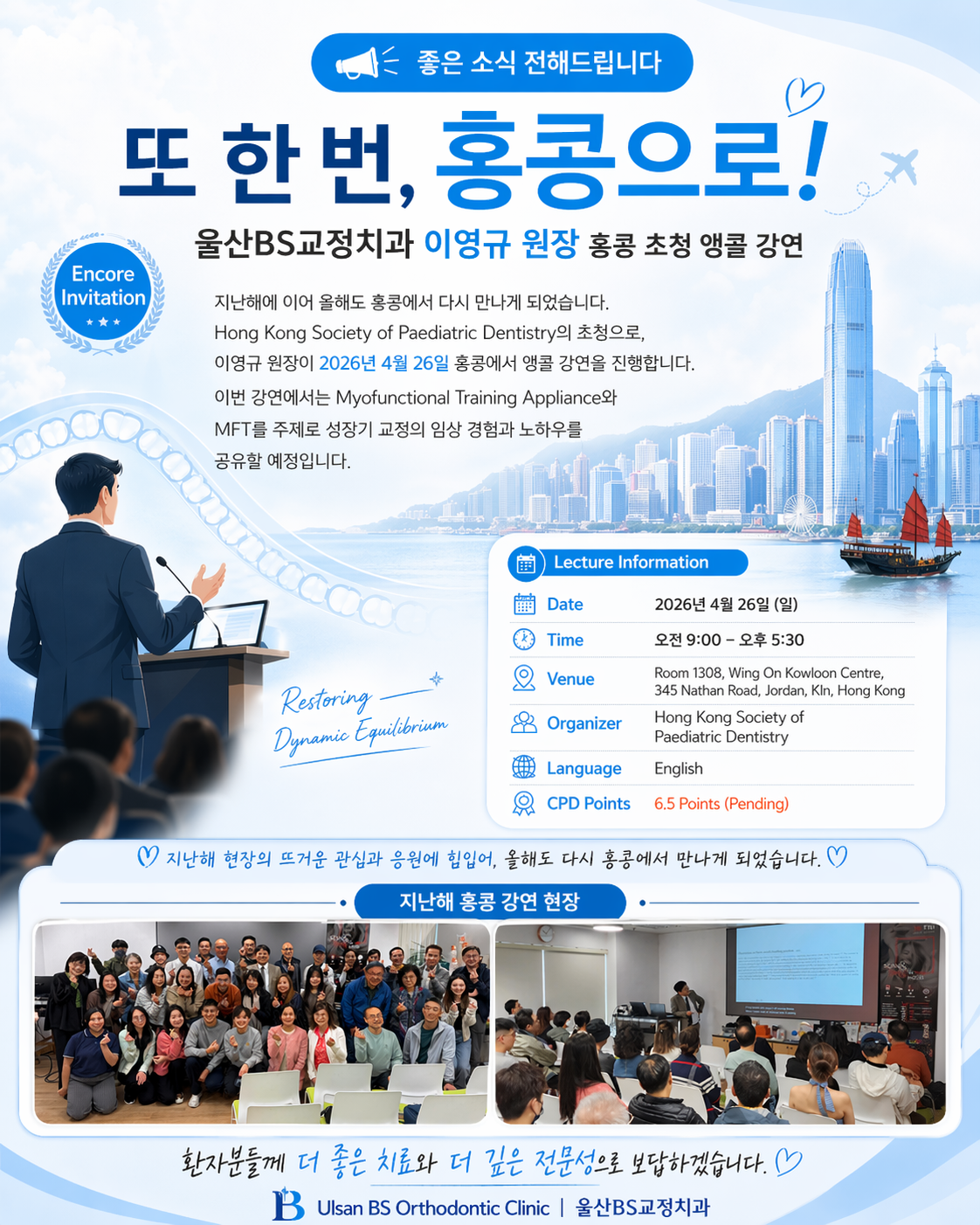 이번 홍콩 앵콜 강연은 울산BS교정치과의 수준 높은 교정 진료 역량을 국제적으로 다시 한번 인정받는 계기가 될 것입니다. 앞으로도 글로벌 표준을 선도하는 진료로 보답하겠습니다.